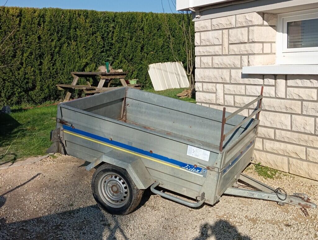 Remorque Lider, basculante, ridelles arrière et avant ouvrable, dimension utile de la caisse 180x135x45 cm.
