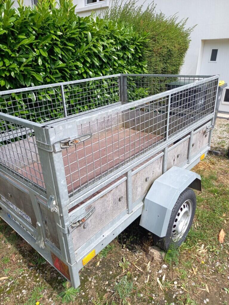 Remorque Le Lagadec simple essieu avec rehausses/grilles démontables par moitié et entièrement. Benne à bascule. Antivol fourni. Plancher refait il y a 1 an.