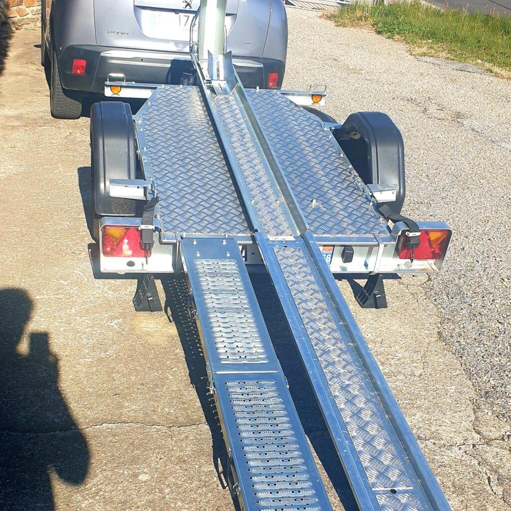 Roue jockey, roue de secours, 3 rampes de chargement, coffre fermeture à clé avec 4 sangles, antivol d'attelage à clé, outils.