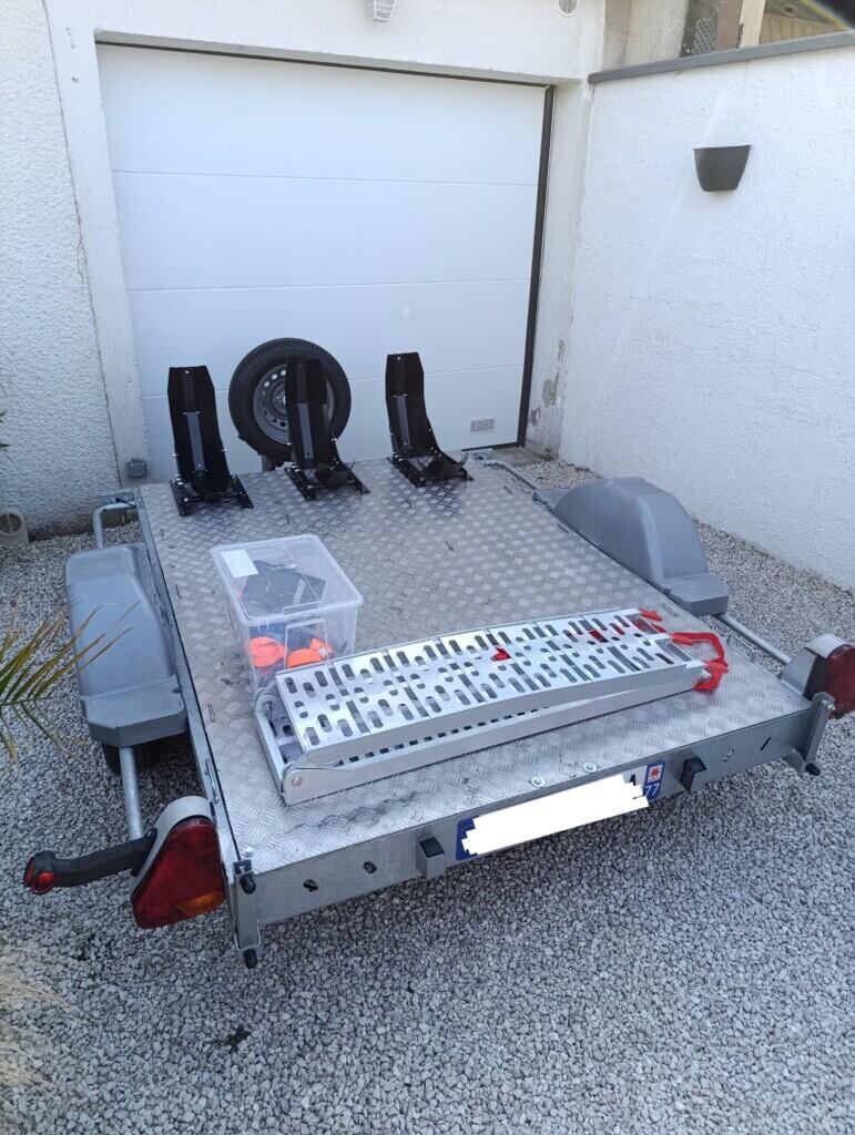 Remorque 1 ou 2 motos PTAC 750 kgs / charge utile 550 kgs, roue 13", blocs roue etc…