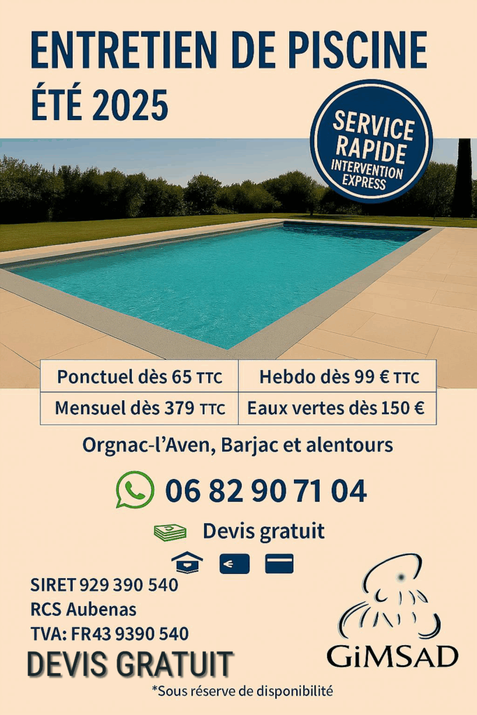 Possibilité d'inclure la location avec une prestation de service d'entretien de votre piscine ou de rattrapage d'eau verte ou autre.