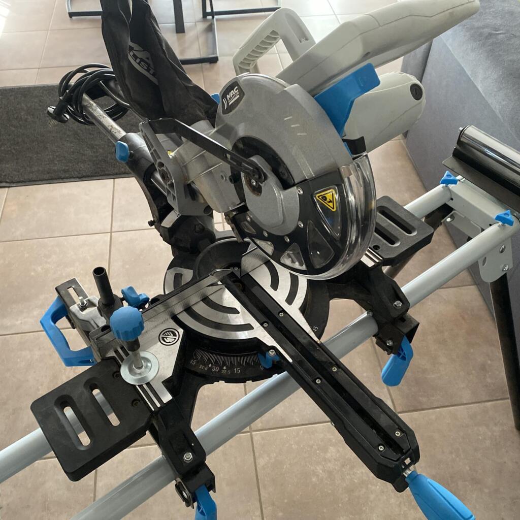 Scie à onglet radiale électrique avec disque multi matériaux. Possible de l’avoir avec le trépied ou non selon besoin (ne change pas le prix de la location)