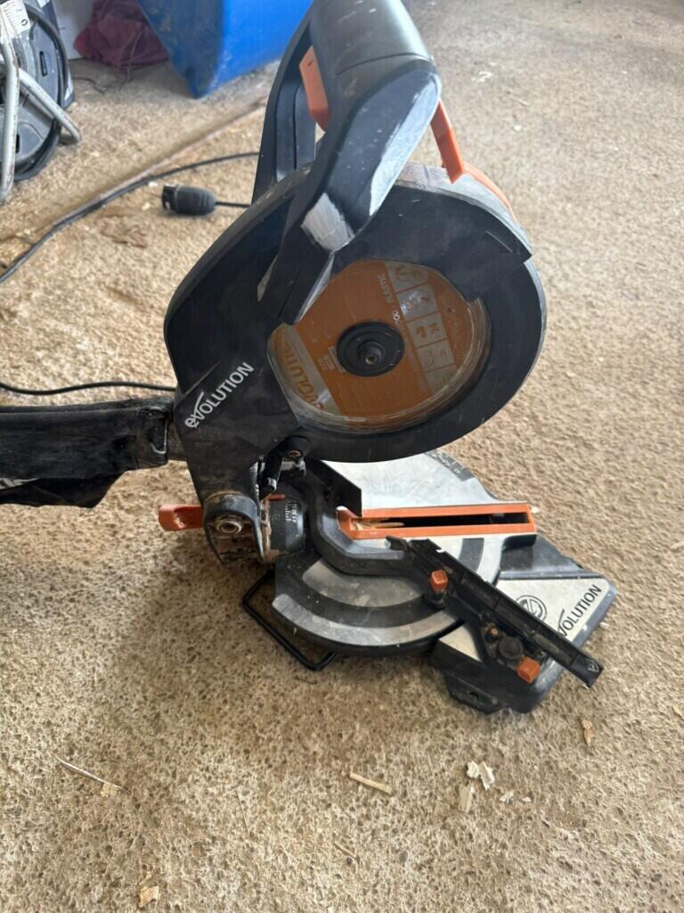 Evolution Power Tools Scie à Onglet Compacte Coupe Multi-Matériaux Lame TCT Incluse Coupe le Bois, le Plastique, 45° – 45° Angle de Onglet et 45˚ Angle de Biseau- 1200W, 210mm