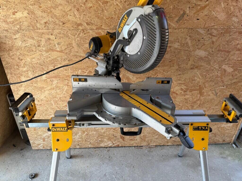 Scie à onglet radiale Dewalt, fournie avec tréteau pour une stabilité optimale.