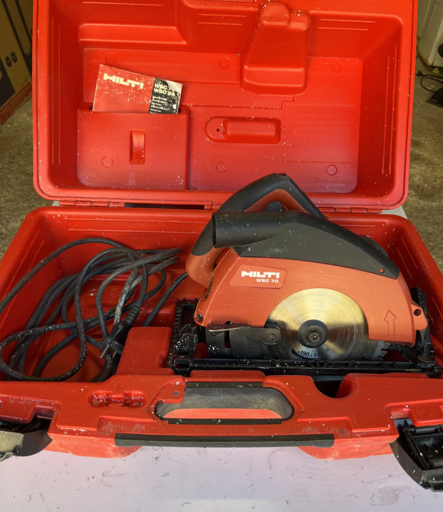 Scie circulaire hilti avec règle pour découpe de précision , très bon état , lame bois et lame métaux non ferreux ( alu )