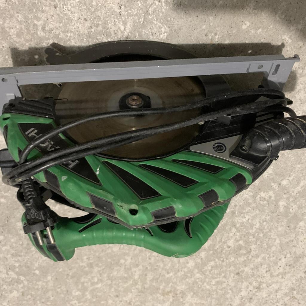Scie circulaire Hitachi, professionnel, pour toute découpe de bois jusqu’à 8 cm, possibilité de réglage hauteur de coupe et inclinaison jusqu’à 45 deg.