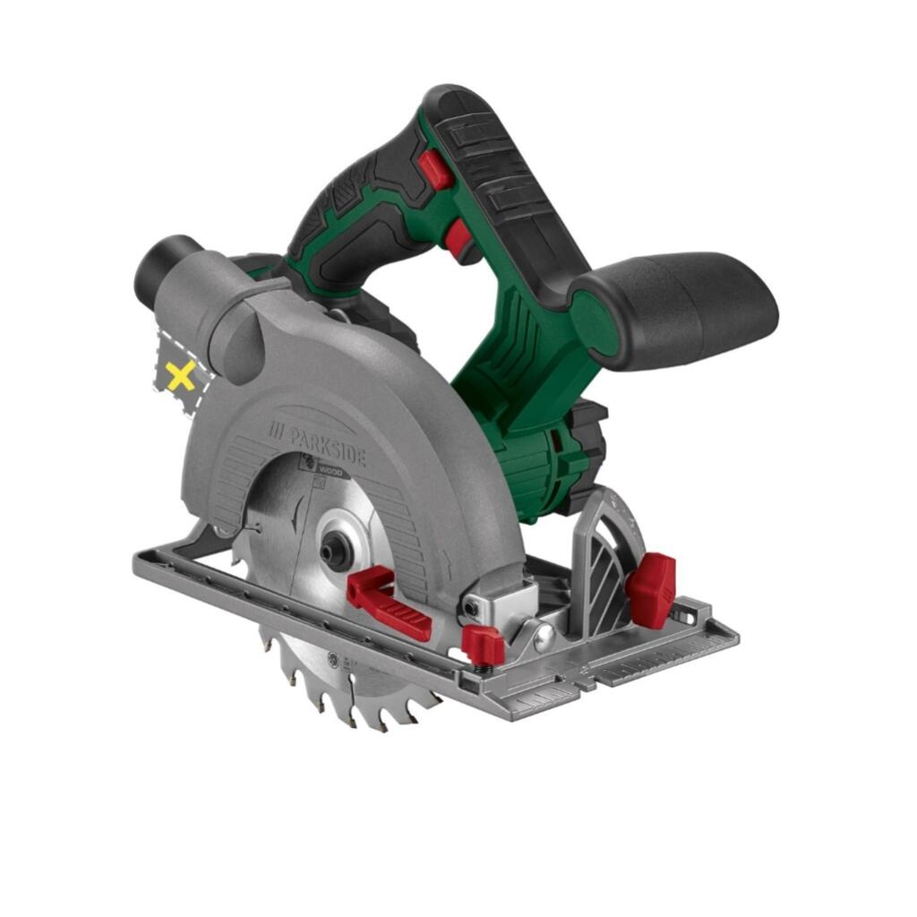 Scie circulaire pendulaire sur batterie fournie avec deux batteries et un chargeur.