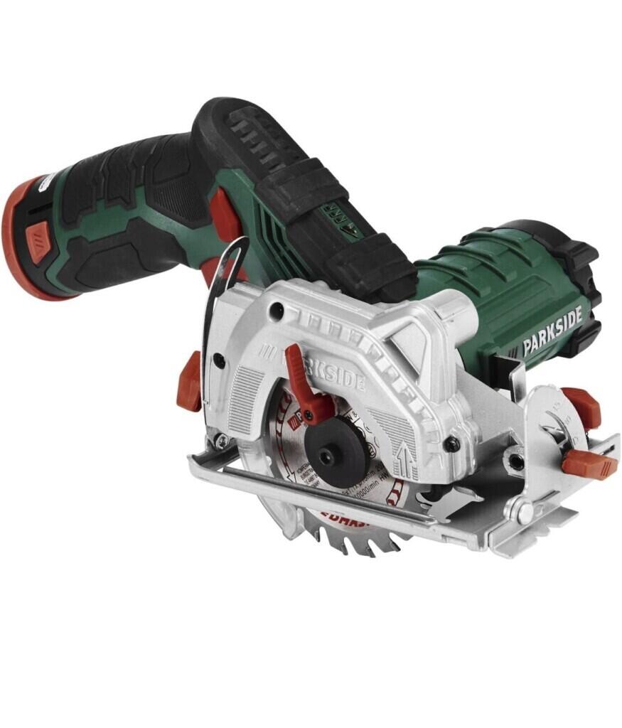 Scie circulaire légère 12 V, lame Ø 85 mm, coupe nette dans panneaux de bois et plastiques. Profondeur réglable jusqu’à 26mm. Idéale pour coupes rapides sans contrainte de câble.