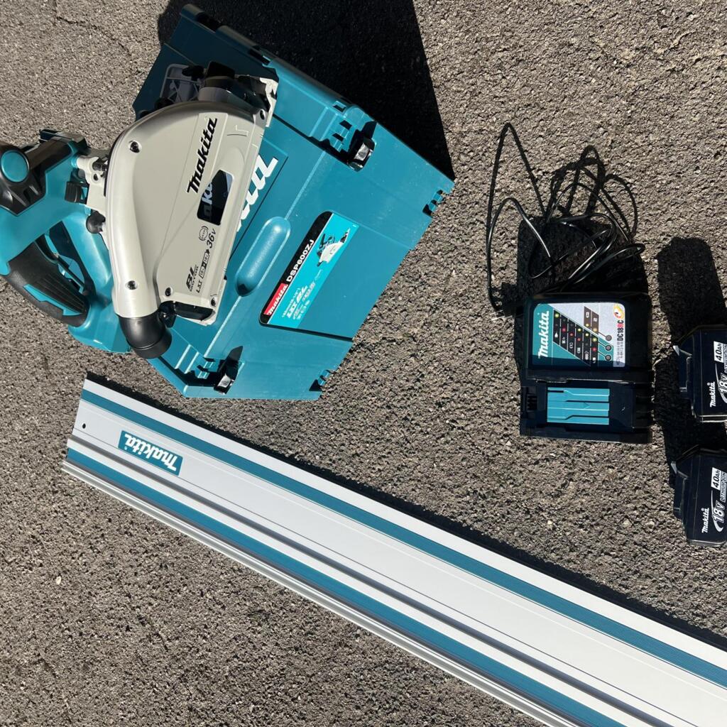 Scie plongeante Makita à batterie , état neuf , loué avec 1 rail de guidage de mm , 1 chargeur et 2 batteries de 4 Ah 18V
