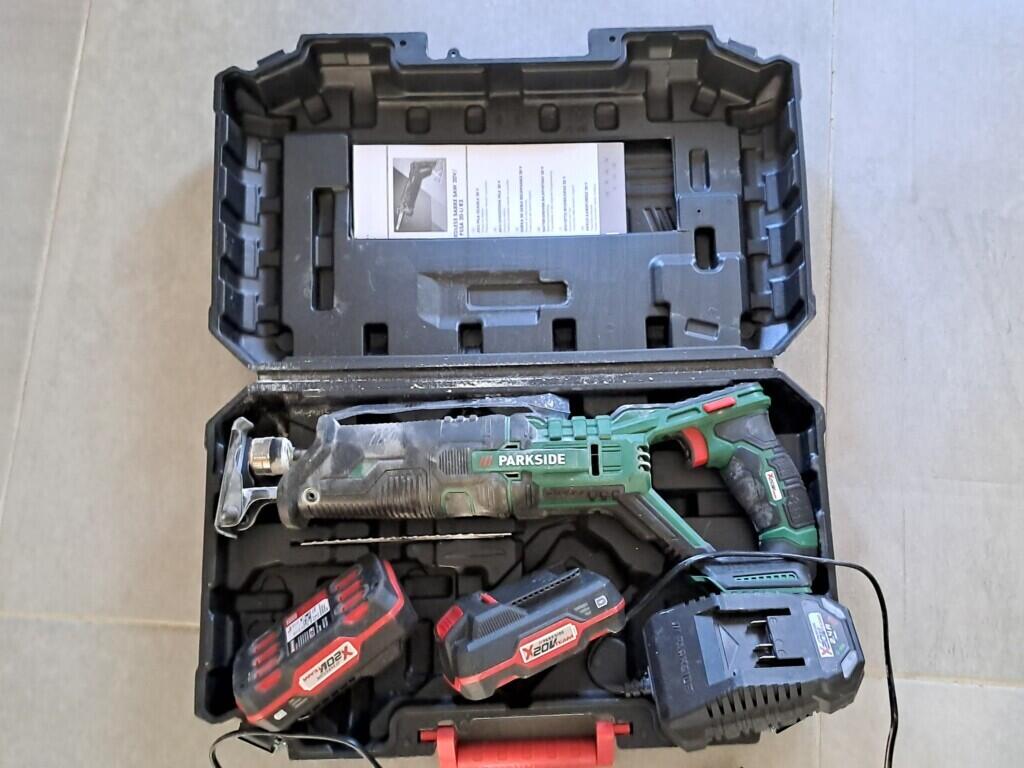Scie sabre en très bon état avec lames, 2 batteries et un chargeur.