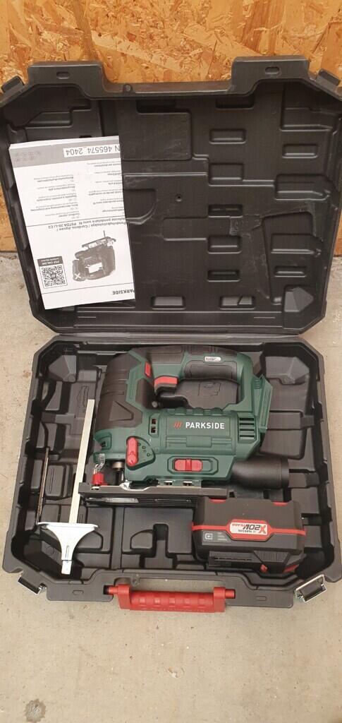 Scie sauteuse pendulaire sans fil parkside avec : mouvement pendulaire, éclairage, 6 angles de coupe.