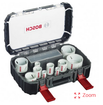 Emmanchement Power Change. Coffret plastique ultra solide de scies trépan Progressor à denture progressive 8 % de cobalt. Convient pour la coupe d'acier, inox, bois, plastique. Composé de : – 11 scies trépan Ø 20, 22, 25, 32, 35, 40, 44, 51, 60, 68, 76 mm, – 1 adaptateur PowerChange, – 2 forets de centrage HSS-G.