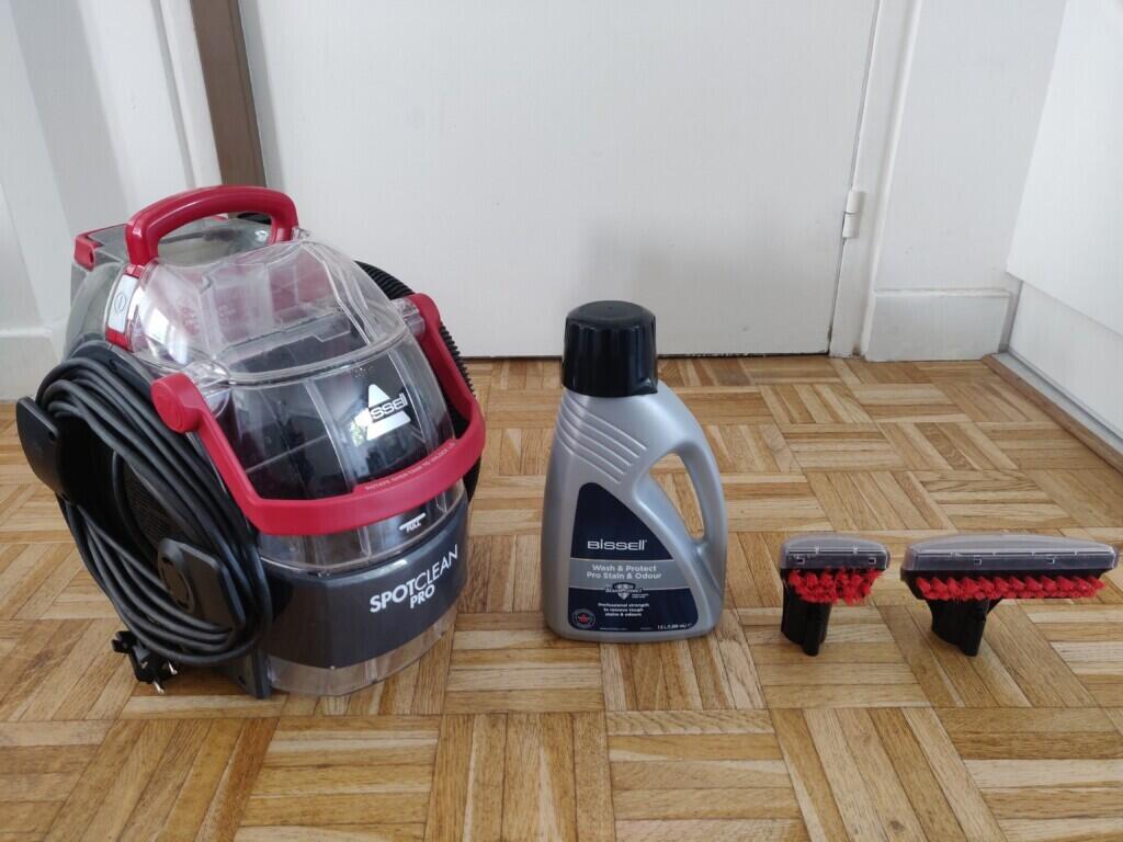 Shampoineuse/nettoyeur détacheur à eau Bissell Spot Clean Pro en excellent état avec ses deux brosses et son bidon de produit détachant.