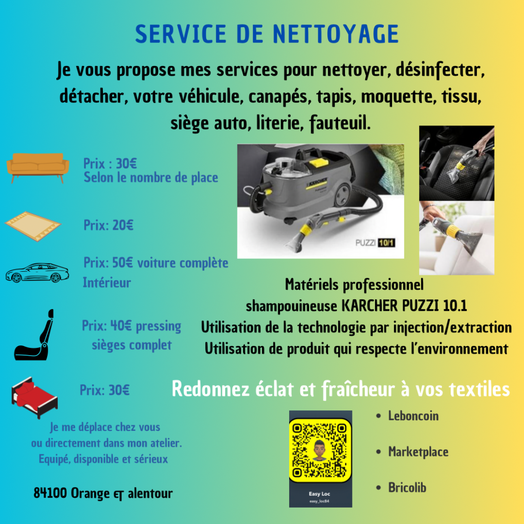 Je suis disponible et sérieux, équipé du matériel adéquat pour garantir un résultat optimal. Utilisant des produits respectueux de l’environnement, je peux intervenir directement à votre domicile ou dans mon atelier.