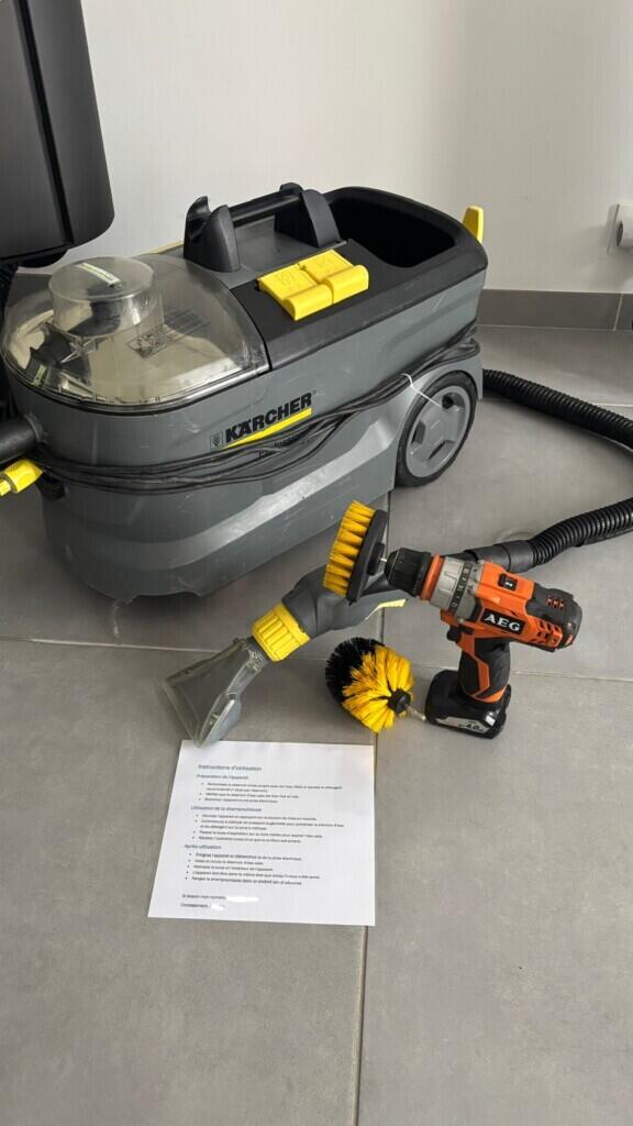 Produit nettoyant, brosse et visseuse fourni.