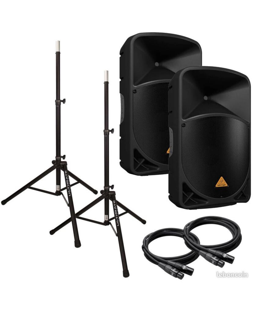 – 2 enceintes Behringer 115D (puissance de 1000W l'unité) avec des pieds