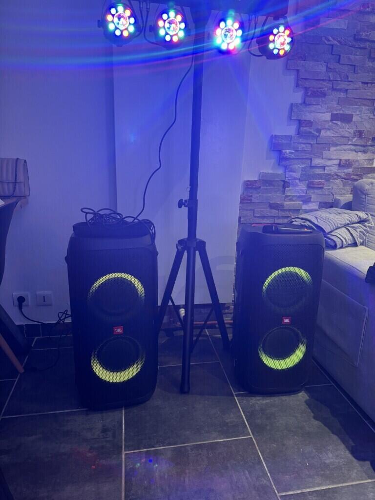 D’une puissance son de 240 Watt l’enceinte dispose d’une autonomie de 18h00, d’un chargement en 03h00. Équipée de roulette comme si c’était une valise, son transport est super facile. Elle dispose de cinq jeux de lumières différentes ainsi que de flash stroboscopiques. Vous pouvez connecter 5 appareils en simultanés et utiliser l’application partybox pour mixer, changer la couleur et le style de lumières et différents réglages son. Sono mariage dj