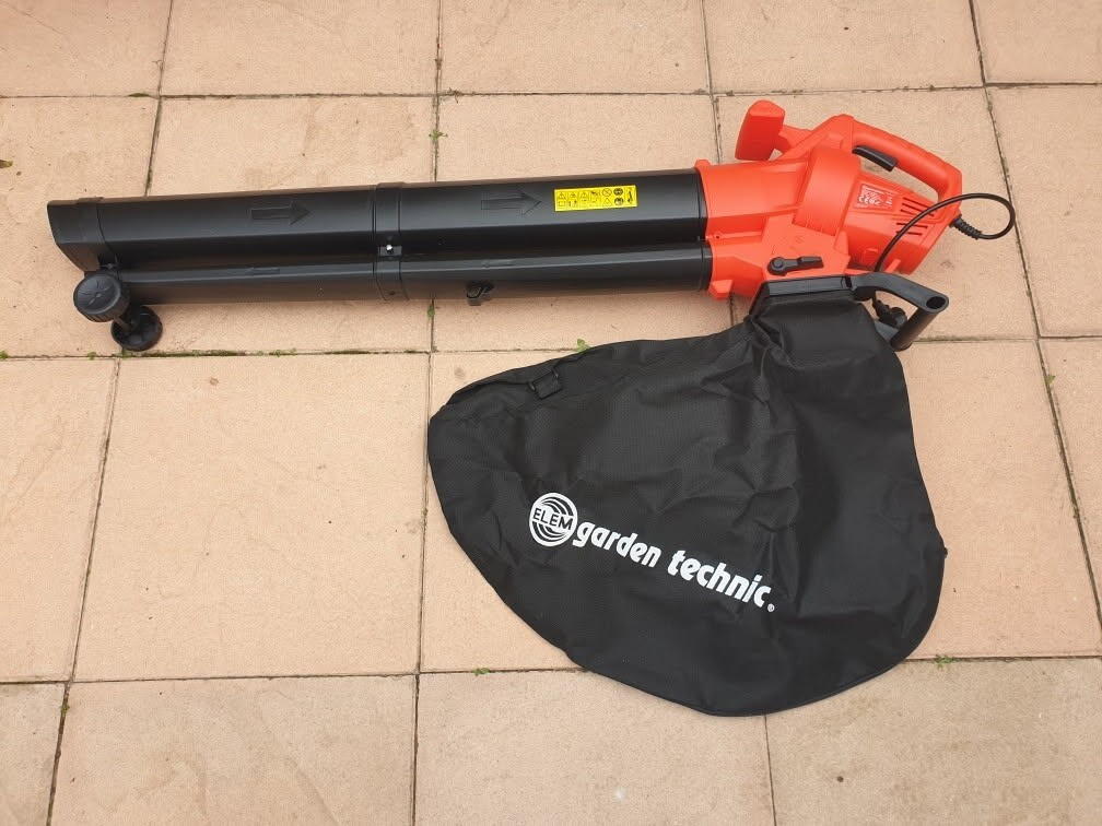Souffleur/Aspirateur/Broyeur électrique pour feuilles et herbes, éventuellement pour la neige, avec roulettes, sangle de maintien et sac de récupération.