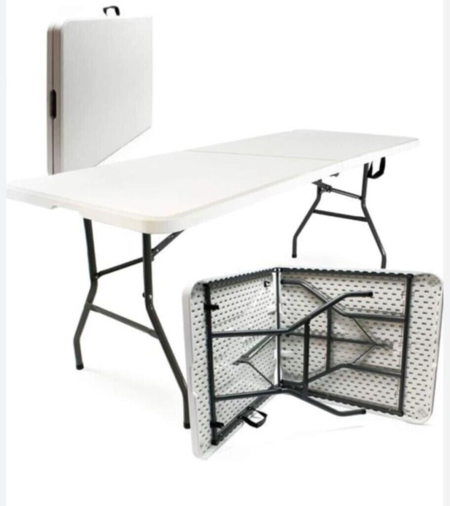 Table blanche pliable 180cm sur 75 cm. Nous en avons 10 de disponible donc possibilité de louer en lot. Les prix indiqués correspondent à une table.