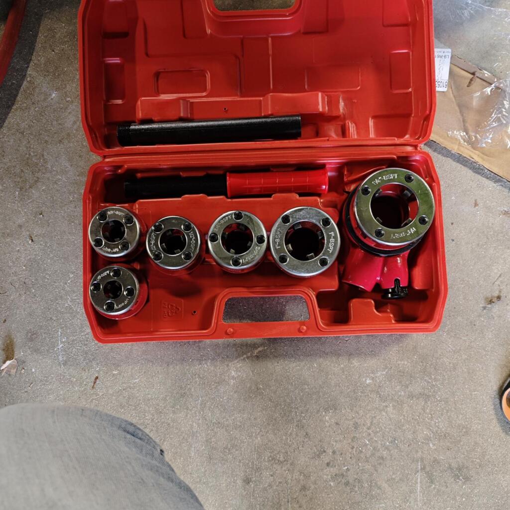 Le set se compose des éléments suivants: 1 x Cliquet réversible droite-gauche 2 x Poignée en acier (rallonge à cliquet vissée l’une dans l’autre) 1 x Filière env. 13,16 mm (¼") 1 x Filière env. 16,66 mm (⅜") 1 x Filière env. 20,96 mm (½") 1 x Filière env. 26,44 mm (¾") 1 x Filière env. 33,25 mm (1") 1 x Filière env. 41,91 mm (1¼")