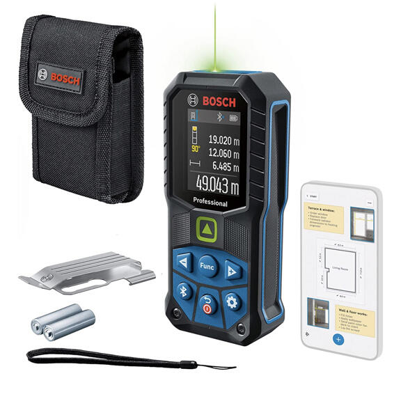 Le télémètre laser Bosch GLM 50-27 CG est doté de fonctions avancées telles que le calcul de la distance indirecte (pythagoricien), le suivi des mesures en temps réel et la connectivité Bluetooth pour transférer les données de mesure vers d’autres appareils.
