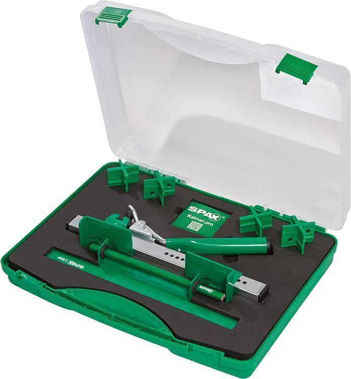 Loué dans son coffret avec 4 unités d'espaceurs SPAX, chacune pour une largeur de joints spécifique : 4 - 5 - 6 - 7 mm