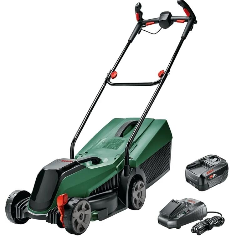 Tondeuse électrique sur batterie. Batterie chargée à la location. Peut tondre environ m2 avec 1 charge. Légère et pratique à transporter.