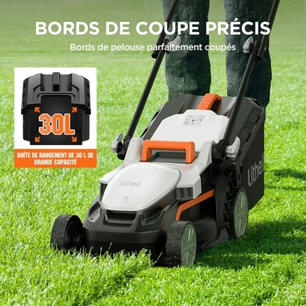 Tondeuse à gazon sans fil 33cm. La hauteur est réglable entre 25 et 65mm et la batterie à une capacité de 4 Ah. Le bac de 30L permet de tondre efficacement votre pelouse. Le chargeur de la batterie est fourni pour la durée de la location.