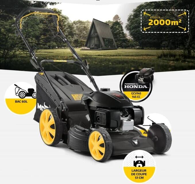 Équipée d'un moteur Honda CGV170 de 167CC, cette tondeuse allie puissance et précision pour façonner votre pelouse selon vos préférences, elle est adaptée pour les grands terrains allant jusqu'à 1800 m² avec une largeur de coupe de 51 cm.