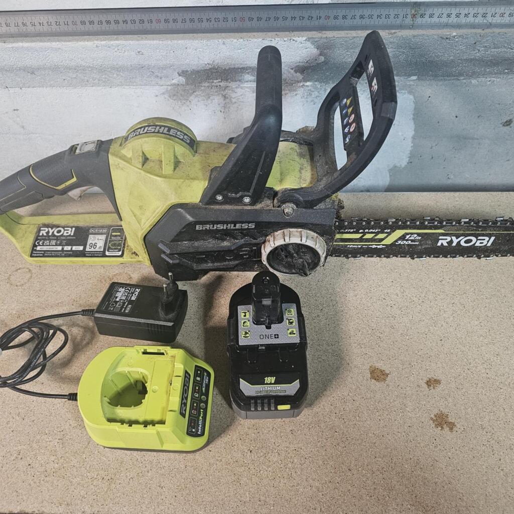Tronçonneuse Brushless 18V ONE+ avec une batterie et un chargeur.