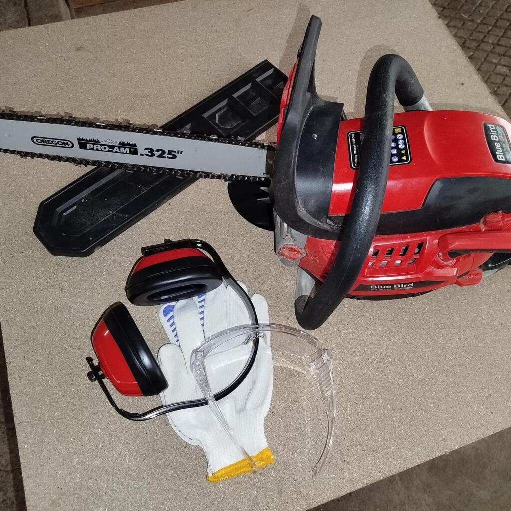 Je vous propose ma tronçonneuse thermique neuve avec guide de coupe de 45 cm.